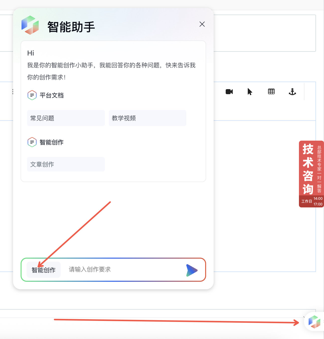 一、新增或编辑文章时点击此图标打开智能对话窗口