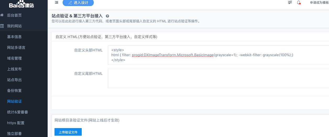 进入站点后台 -> 我的网站 -> 网站验证,将如下代码添加到自定义头部HTML里即可