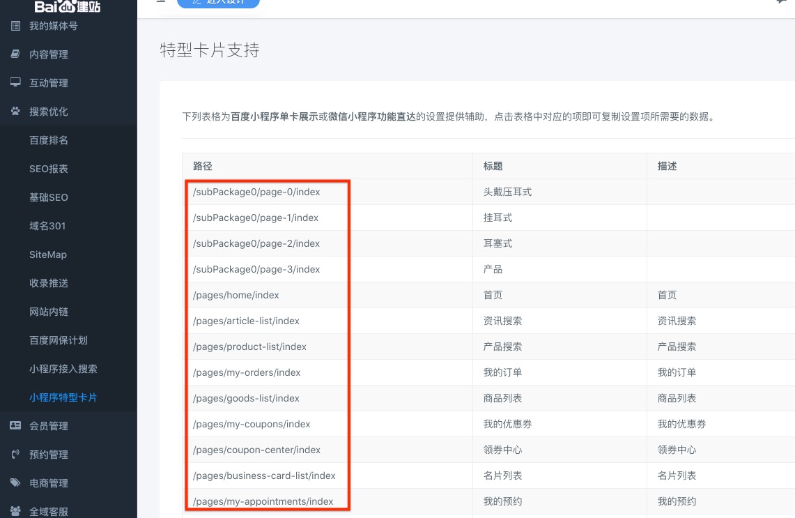普通页面路径可以在搜索优化 -> 小程序特性卡片里查看。通过获取页面路径可以对特定页面生成二维码,例如配置百度小程序单卡和微信功能直达时只用,方便用户扫码或点击直接进入特定页面。