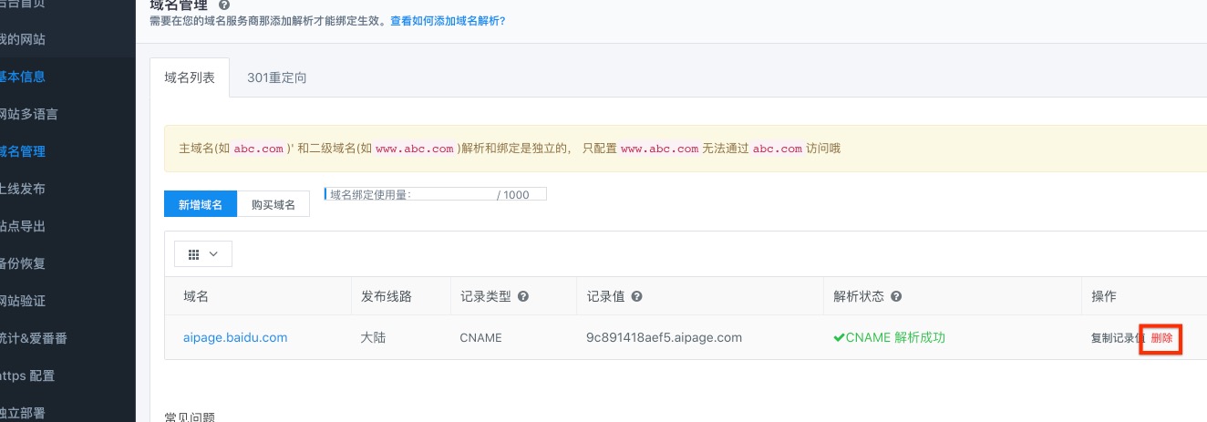 一般如果域名已在第三方平台备案,在百度云备案期间依旧可能被拦截(工信部规定域名备案必须跟网站机房所属平台对应),可以将域名站点先发布到香港线路,备案完成后再切换到大陆线路。线路切换与添加域名操作一致,首先删除域名管理里面需要切换的域名: