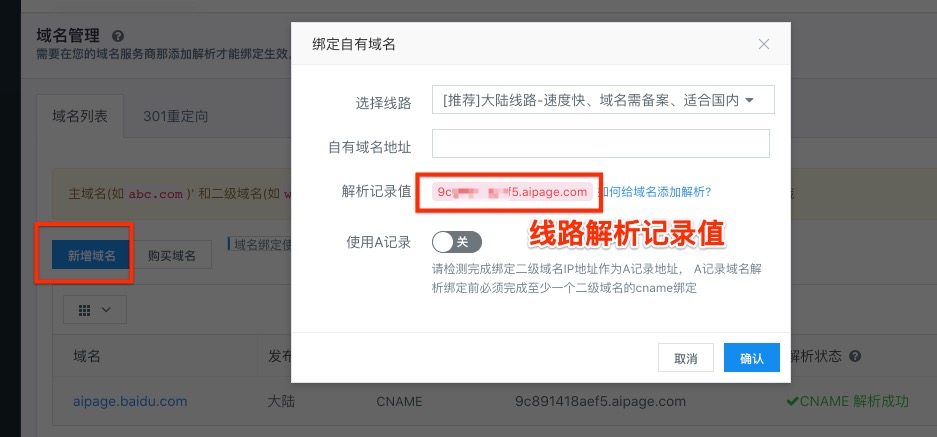 然后重新选择线路添加此域名,添加时能看到对应线路的解析地址。添加完成之后域名可能显示解析错误,因为这时候域名解析地址还是之前的线路地址。去域名服务商那将域名解析修改成新的线路的解析地址,待解析完全生效后查看建站后台域名管理域名状态是否正常,正常后发布上线即完成了线路的切换工作。