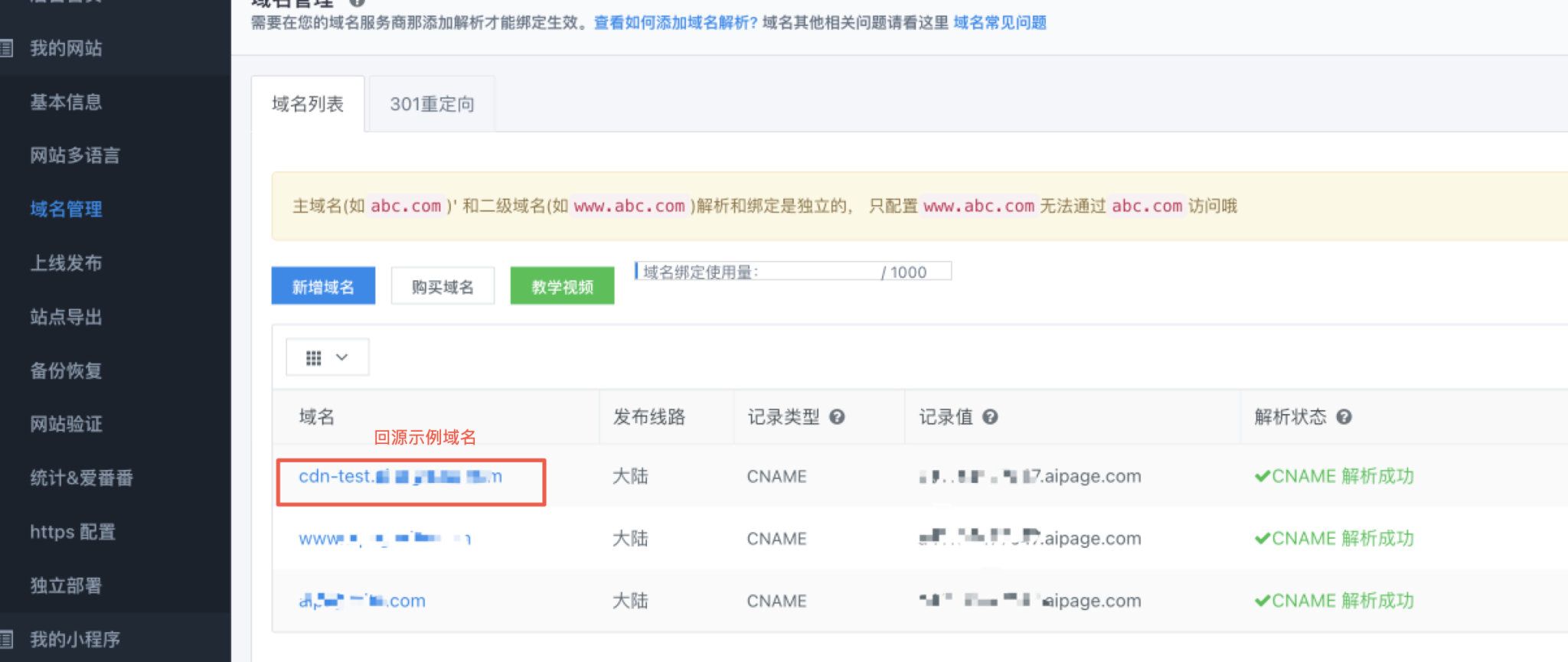 1 在域名管理解析并绑定一个二级域名作为回源域名使用,解析成功后发布网站,确保可通过此域名访问站点