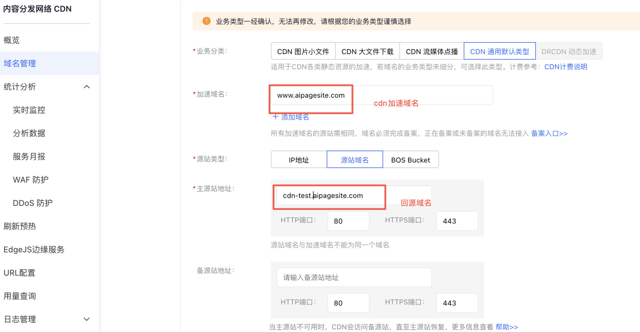 大陆线路接入cdn操作方式一样,主要步骤也是提供一个二级会员域名作为源站供cdn抓取所用。接入示例: