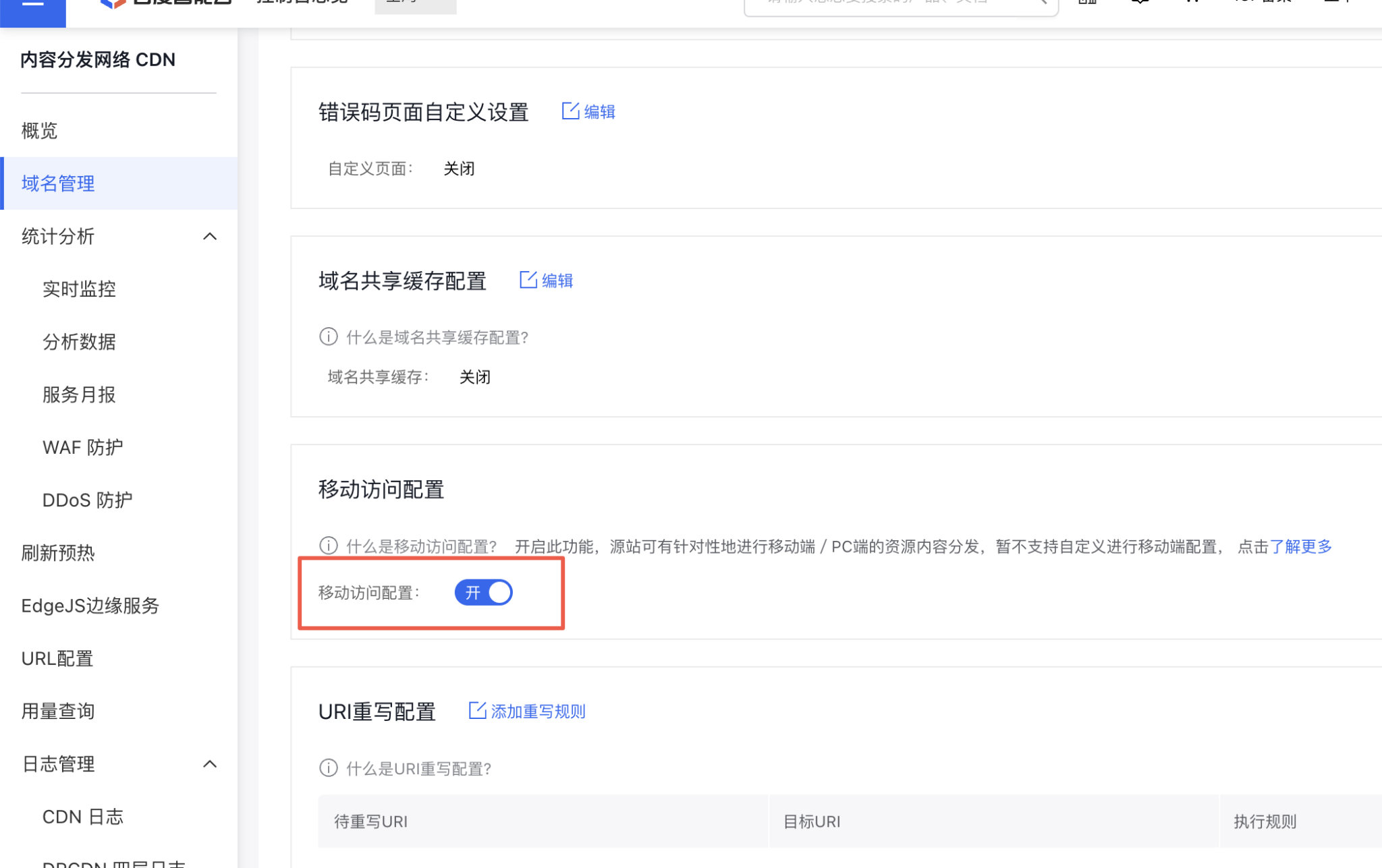 3 域名缓存里开启移动访问配置,不同的cdn服务商配置可能略有差异。意思是同个域名是否区分移动端独立页面