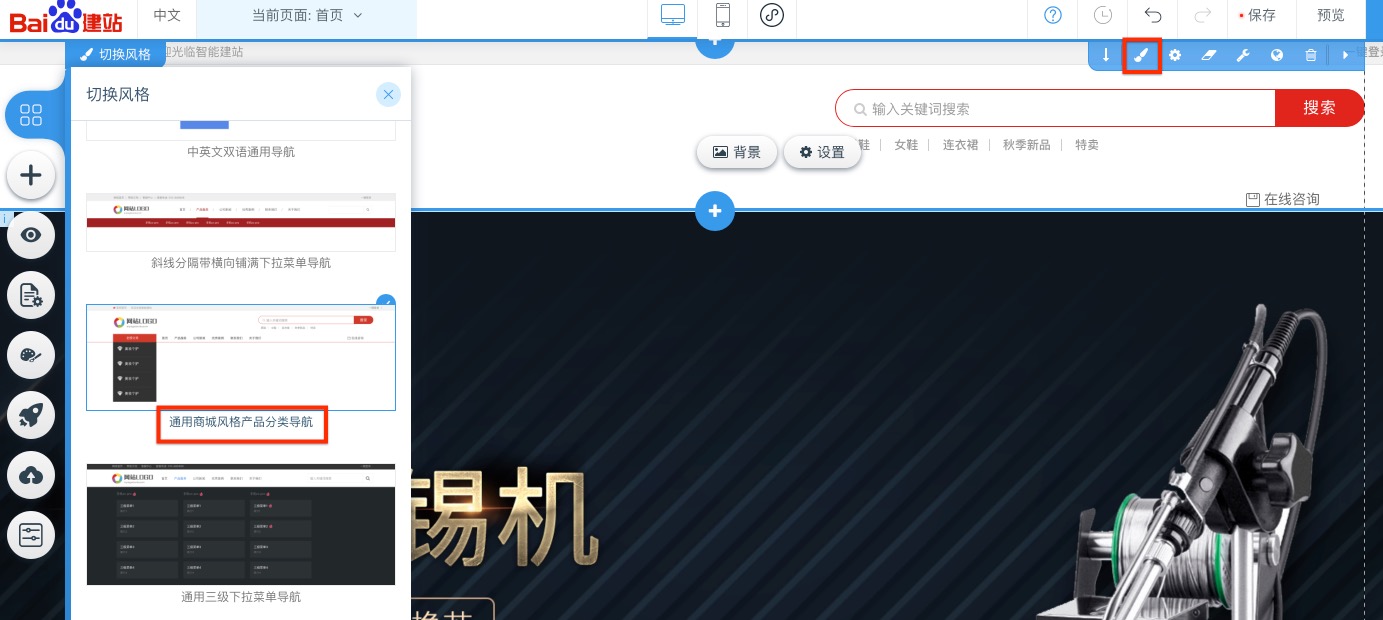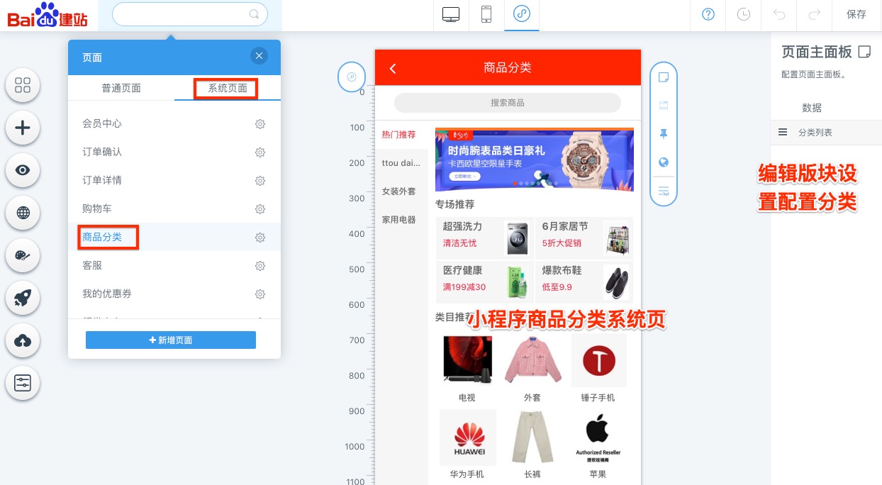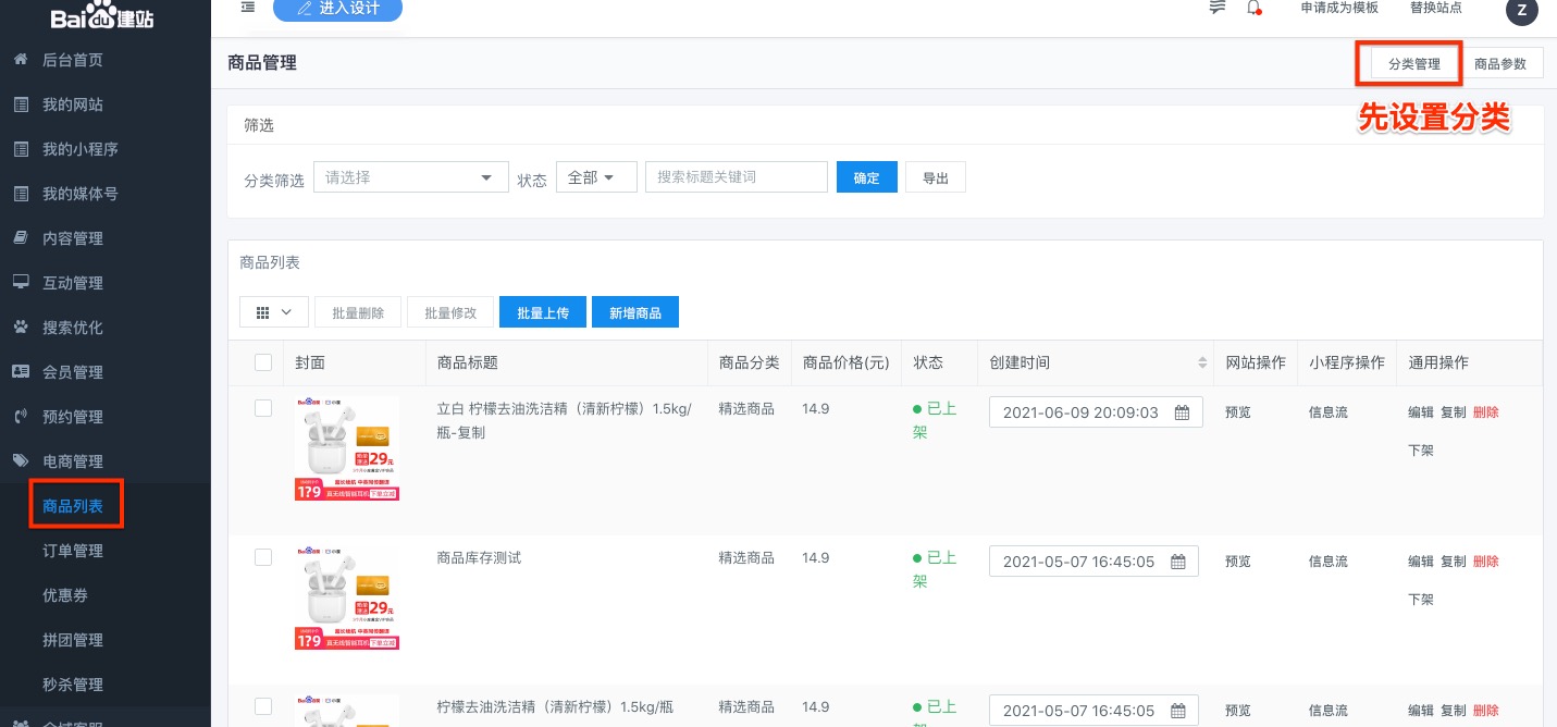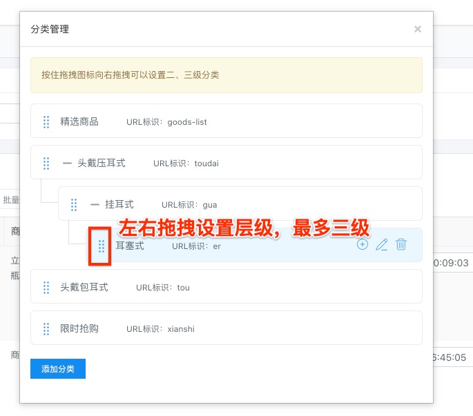 进入管理后台 -> 电商管理 -> 商品列表,添加商品先需要先设置分类。打开分类管理列表,添加网站规划的商品类目,横向拖拽左侧的按钮可以调整层级,上下拖拽可以调整顺序,最多支持三级分类。如果商品分类较多,站点首页头图版块可以商城风格内置导航,可以实现三级商品分类菜单弹框展示,小程序内也有专门的商品分类系统页面,方便展示多个商品类目。
