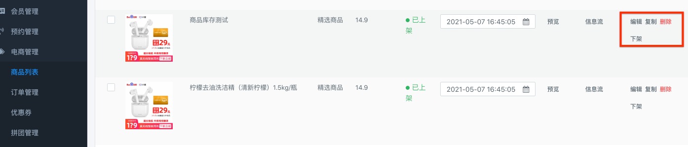 商品列表可以对商品进行常见快捷操作,例如上架、下架、复制、删除等。