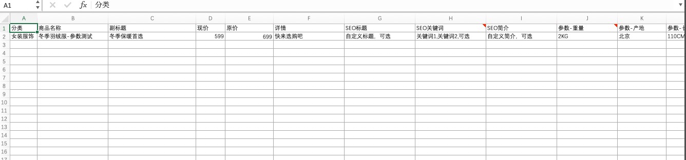 商品积分信息支持通过excel方式批量导入,点击批量上传下载示例文件,按照格式要求填写商品基本信息即可。商品参数、SEO等信息是可选的,如果有多个商品参数,按照实例格式在后面追加,商品参数需要保留"参数-"前缀作为识别标识,前缀后面的名称才是实际的参数名称。
