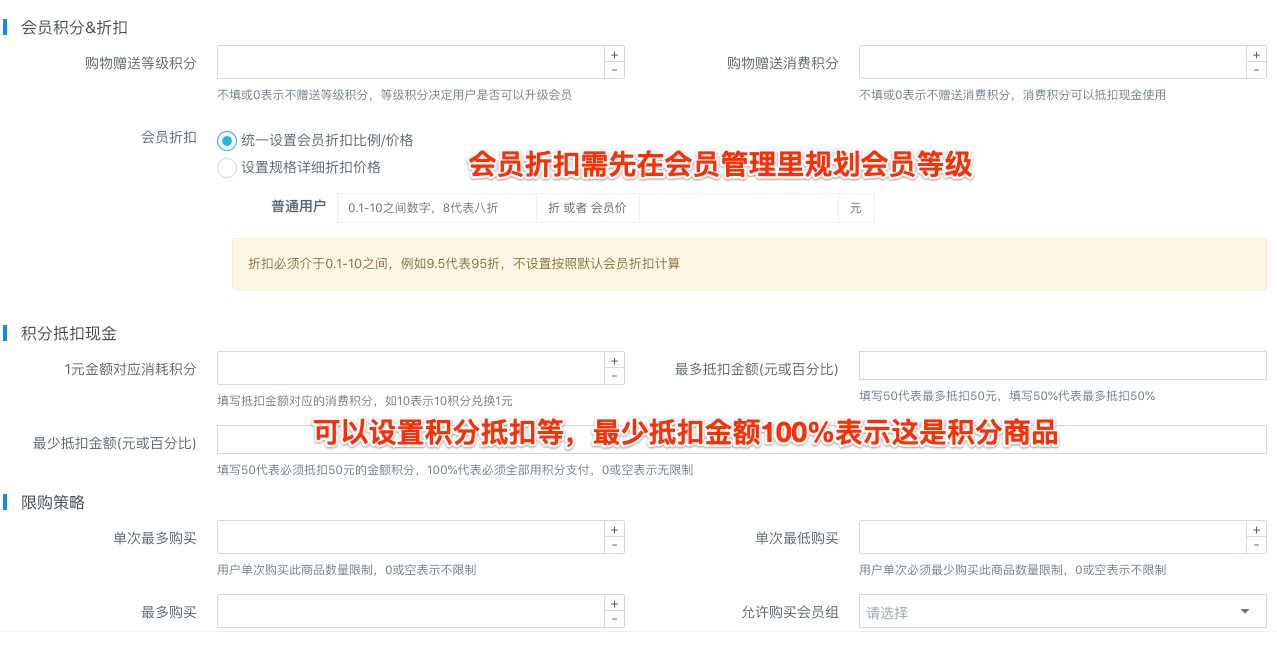 商品购买也可以设置独立的积分抵扣信息,如设置最多允许低分抵扣30%的金额,或者最少抵扣100%的金额(这相当于商品为积分商品,只能通过积分购买)。这样就可以新建一个专门的积分商品类目,实现简单的积分商城管理。