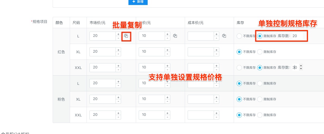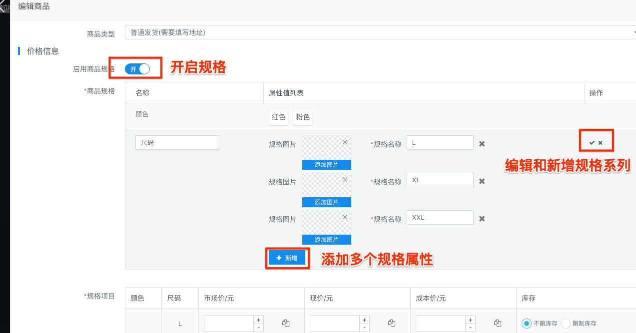 商品规格可以实现用户购买时选择对应的产品规格,不同的规格可以设置不同的价格和库存,操作类似淘宝等通用商城购买设置。在开启规格后需要编辑每个规格及其属性,每种规格需要至少一个属性(如果只有一种属性就没必要创建此规格,加标题或简介里即可),例如颜色,设置红色、粉色等,商品规格还可以设置图片,这样可以在商品购买页看到对应的缩略图。